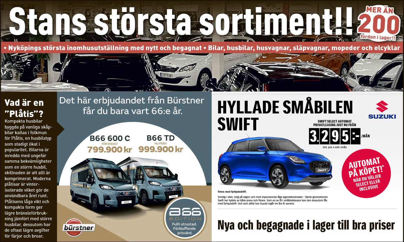 Nyköpings främsta fordonshandlare sedan snart 35 år, med ca 250 fordon, nya som begagnade i lager. Här kan du förutom Nyköpings största begagnatsortiment, köpa nya Suzuki, Bürstner Husbilar, Hobby & Eriba Husvagnar, Neptun & Tiki släpkärror.