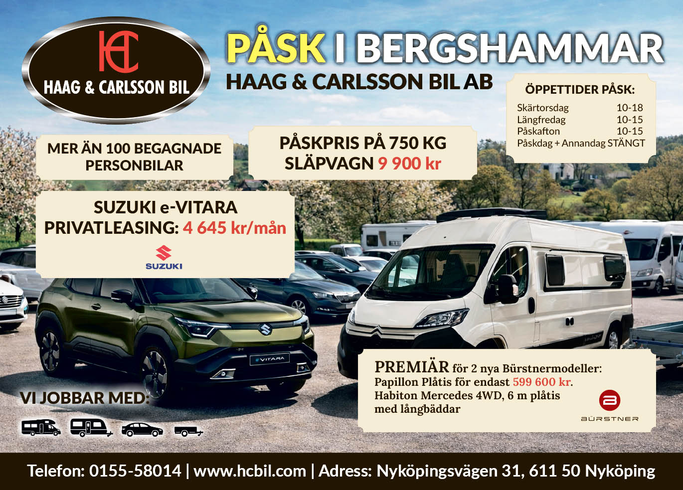 Nyköpings främsta fordonshandlare sedan snart 35 år, med ca 250 fordon, nya som begagnade i lager. Här kan du förutom Nyköpings största begagnatsortiment, köpa nya Suzuki, Bürstner Husbilar, Hobby & Eriba Husvagnar, Neptun & Tiki släpkärror.